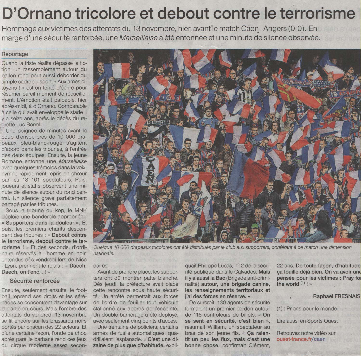 La Marseillaise accompagné de 10 000 drapeaux Français est rarement chanté dans ce Stade Normand, mais en ce jour du 22 novembre 2015, elle fut entonné d'un très fort esprit d'union et d'une volonté sans faille de ne pas céder à la folie d'illuminés.