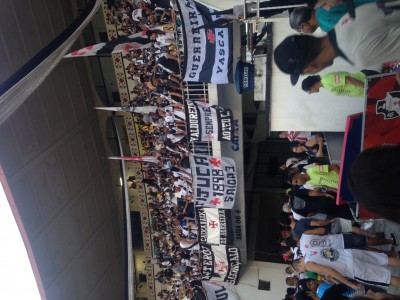 Une fois dans le stade, nous pouvons librement aller de la latérale jusqu'a derrière le but. Nous decidons donc de nous places près des "Guerreiros" derrière le but afin de pouvoir profiter au maximun. Je n'ai pas tout compris sur la torcida de Vasco mais 3 noms de groupes sont présent un peu partout autour du stade, "rasta", "tra jovem" et les "Guerreiros". Le second est situé en latérale tandis que le premier est en tribune avec les Gueirreros. Un petit groupe actif de jeune issus de la Favela qui se situe juste derrière le stade occupe le quart de virage.