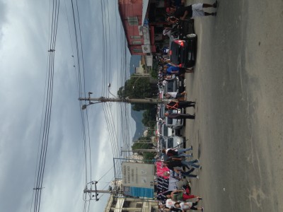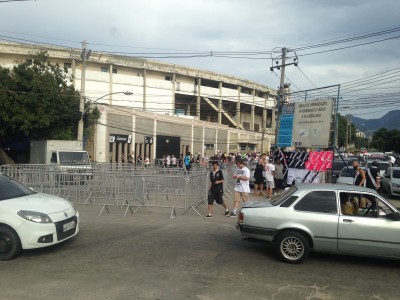 14h30 nous voilà autour du stade, enfin dans la rue du stade où se côtoient vendeurs ambulants, bars, grillades, boutique officielle, billeterie et entrée du stade ! Une sacré gueule où nous ressentons directement l'âme de Vasco. Tous le monde est habillé en noir et blanc, même les voitures sont toutes d'origine noir ou blanche.