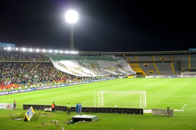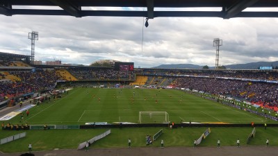 Avant le coup d'envoi, l'ensemble du stade chante l'hymne colombien, suivi de l'hymne de Bogota. Ce dernier donne des frissons, toutes les tribunes chantent à bloc, et le chant se fini par un “BOGOTA! BOGOTA! BOGOTA!” monstrueux. Le match débute alors que des gens continuent de rentrer dans le stade, les 3 fouilles faisant perdre du temps au public. En face, dans la tribune Nord, les barras bravas de Millonarios non-interdites commencent à mettre l'ambiance. La latérale est bien garnie et presque tout le monde est debout. A notre droite le parcage de Santa Fe a l'air bien chaud et a poussé son trip nippon en sortant une banderole écrite en japonais. Notre tribune se met à chanter et c'est du très lourd. Les chants sont assez lent et super puissant. Le “qui ne saute pas est une pute” fait totalement bouger la tribune au sens propre. La structure en béton bouge énormément, et des grincement peu rassurant se font entendre sous nos pieds. Je me retourne et je vois le mur du fond de la tribune monté et descendre par rapport au toit, c'est du grand nimportequoi!