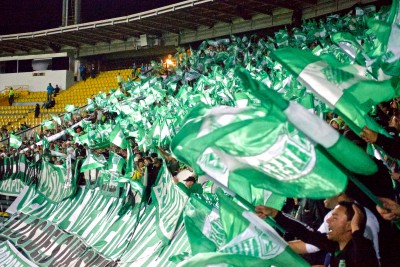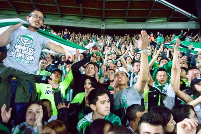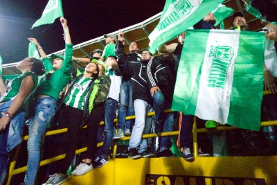 Les chants patent très puissamment, la tribune est bien festive, plutôt jeune, et avec plus de filles qu'en Europe, comme d'habitude ici. Au bout de quelques minutes, Atletico Nacional obtient un pénalty, et la panenca de l'attaquant déclenche une violente avalanche dans notre secteur. Les chants retentissent de plus belle alors que la tribune, déjà pleine, continue de se remplir. Vers la 30ème minute les tambours et trompettes rentrent enfin pour rythmer les chants et rajouter un truc à cette ambiance carnavalesque. A ce point on est ultra serrés en tribune, je n'arrive même pas à lever mes bras, compressé dans une foule verte. C'est la folie furieuse dans notre secteur, grosse ambience sud américaine comme on les aime !