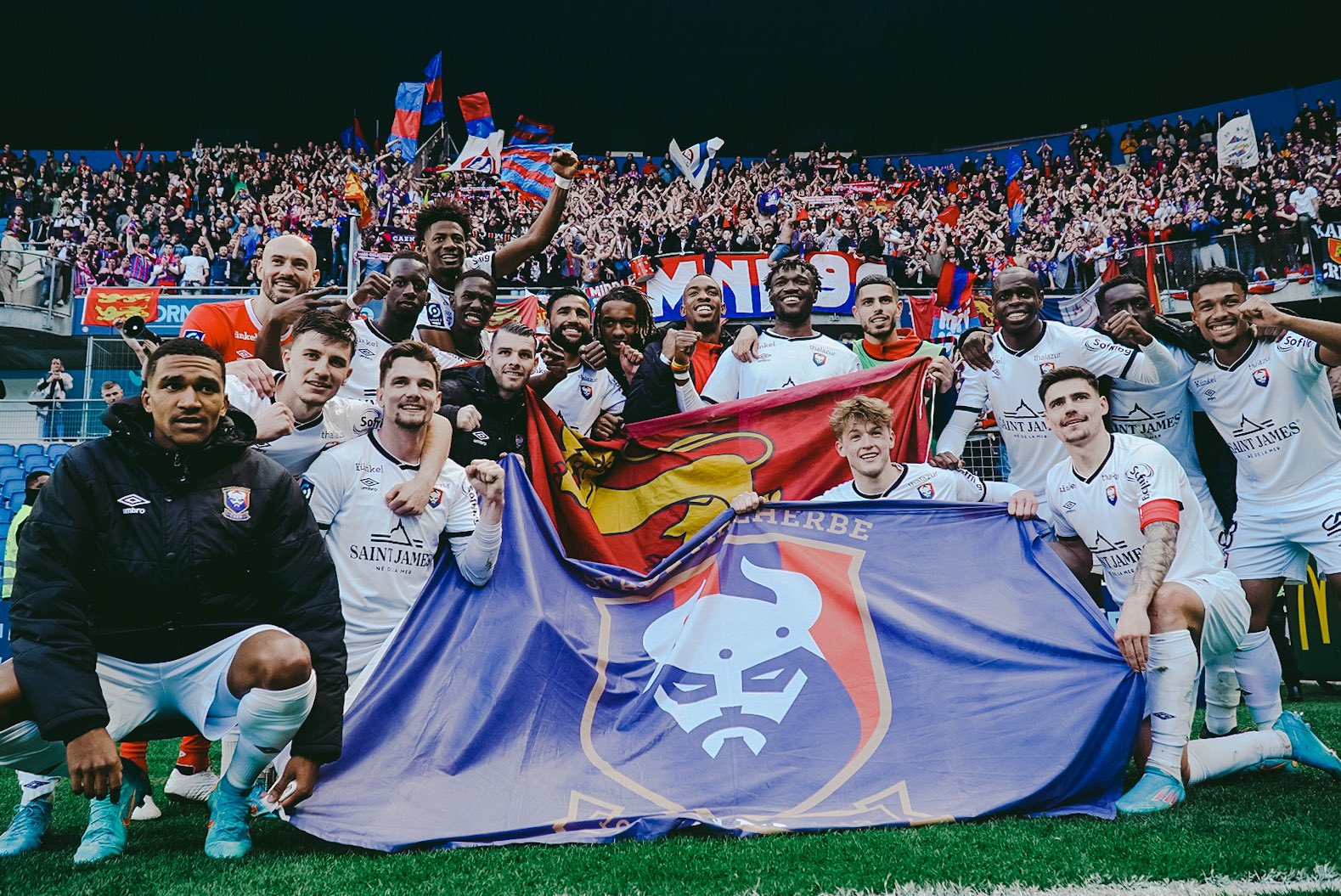 En deuxième mi-temps, la digestion ne facilite guère l'ambiance et c'est un peu poussif d'autant plus que les Havrais arrivent à égaliser. Cela a le mérite de relancer l'intérêt du match et l'ambiance dans la tribune. Les chants redoublent d'intensité et sur une action rondement menée, Hugo se fait sécher dans la surface. C'est le pénalty et le parcage laisse exploser sa joie. Jessy s'occupe de tirer le penalty et vient célébrer son but devant la tribune en folie. On a à peine le temps de reprendre nos esprits que nos guerriers sur le terrain sont repartis à l'attaque et sur une superbe inspiration de Jessy, Benj Jeannot marque son but et court directement vers le parcage pour partager sa joie. C'est de la folie pure et simple, le scénario que personne ne pouvait imaginer. On en croit pas nos yeux du match qui est en train de se dérouler, entre bonheur et stress car le match n'est pas fini. Et comme Malherbe reste Malherbe, on se prend un second but 2 minutes après celui de Jeannot. Il ne reste que quelques minutes à jouer et notre rôle est de permettre aux joueurs de garder ce score et de gagner une nouvelle fois à Océane. Les chants partent dans tous les sens, les capos ont parfois du mal à se faire entendre pour bien les coordonner. Et dans les arrêts de jeu, Jessy profite d'une boulette du gardien havrais pour inscrire le dernier but synonyme de délivrance. Là, on se dit que plus rien de grave ne peut nous arriver ! On saute de joie dans le parcage ! On se prend dans les bras, c'est du bonheur à l'état pur avec un scénario de dingue ! Au coup de sifflet final, plusieurs joueurs viennent directement partager leur joie avec nous, ils sont vite rejoints par le staff et la direction du club. Un drapeau normand leur est donné pour qu'ils prennent la pose et affirmer que la Normandie est belle et bien rouge et bleu ce soir. La plupart des joueurs donnent leur maillot à ceux montés sur les grilles pour les remercier de leur soutien. Une fois la pression retombée, on commence à réaliser ce qui vient de se passer et qui restera sûrement dans l'histoire du club. Après quelques minutes d'attente, on est enfin autorisé à sortir et chacun remonte dans son bus.