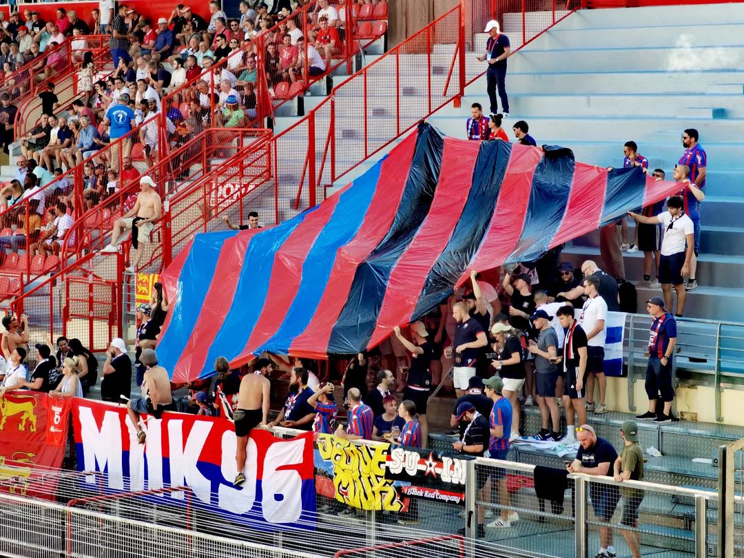A l'entrée des joueurs une voile en forme de d'écussons est déployé, les bandes noires rouge et bleue rappel les couleurs du FC INGOLSTADT et celles du SM CAEN.