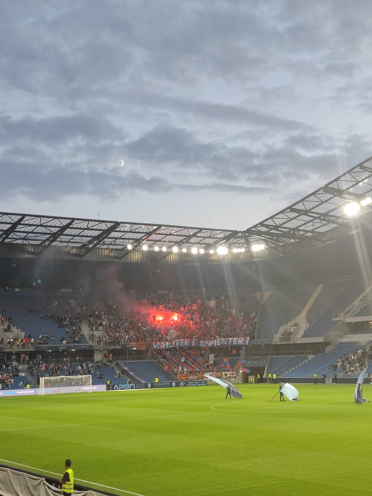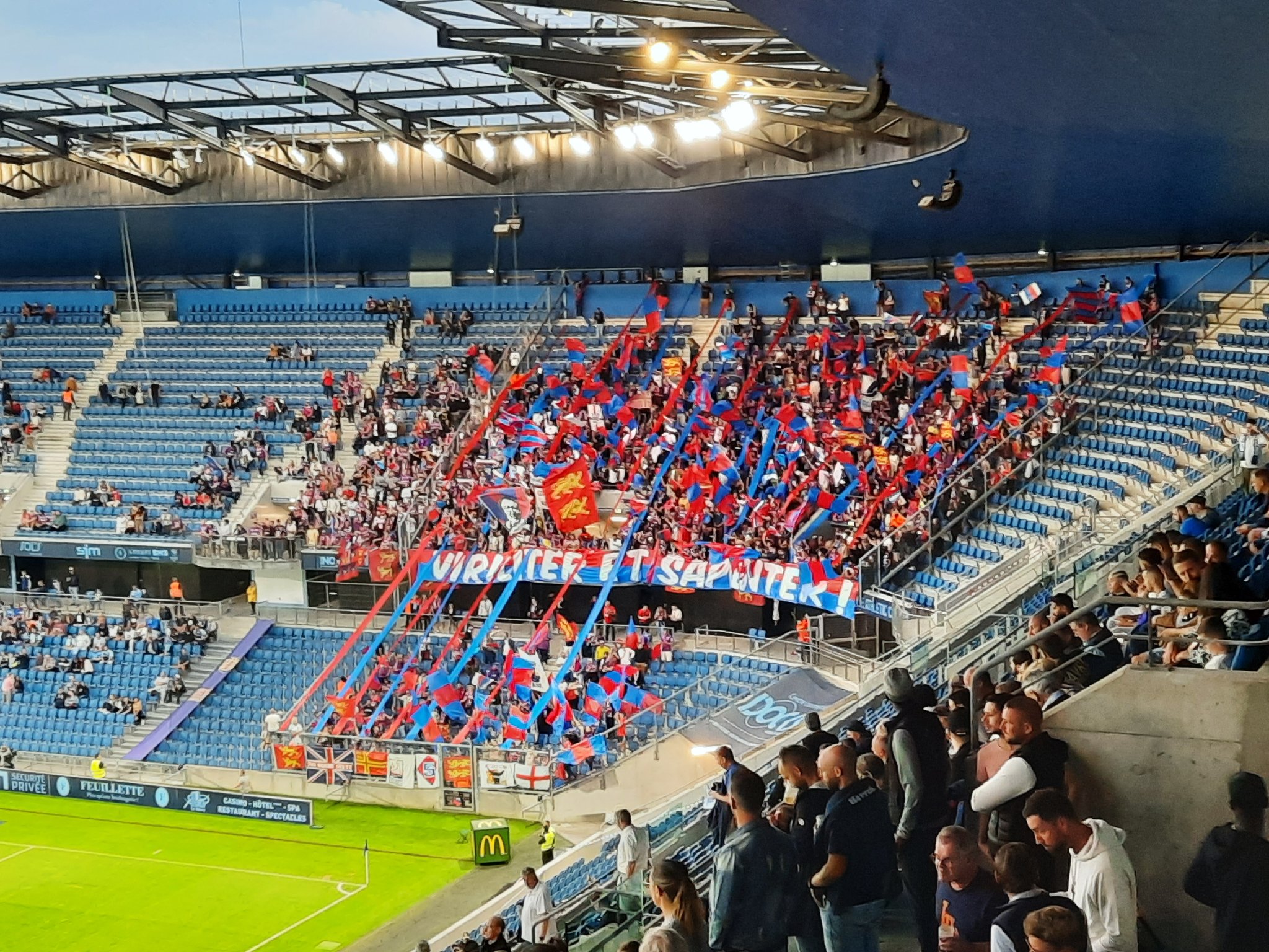 A l'entrée des joueurs, des petits drapeaux sont agités et des bandes rouges et bleues descendent du haut du parcage. Une grande phrase est affichée : "VIRILITER ET SAPIENTER” (courage et sagesse), une devise des conquérants normands présente sur la tapisserie de Bayeux. Quelques torches sont aussi craquées et donnent un super effet au tifo. Le premier chant est lancé et tient pendant de très longues minutes, jusqu'au fait de jeu qui change la physionomie du match : le faux pénalty de la 6e minute. On encaisse un but mais le parcage ne se décourage pas et les chants continuent d'être soutenus. La coordination n'est pas pratique d'autant plus que le parcage s'étend sur la largeur sur la partie haute. En effet, après de longues minutes, les stadiers concèdent enfin aux supporters bloqués, l'accès au contre-parcage. Les capos sont obligés de se décaler pour pouvoir mieux lancer les chants et être audibles de tout ce petit monde (dur à estimer, 1 500 ? 1 700 ?). Pendant cette première mi-temps, on a pas grand chose à se reprocher au niveau tribune, on fait le taff même si c'est dur sur le terrain.