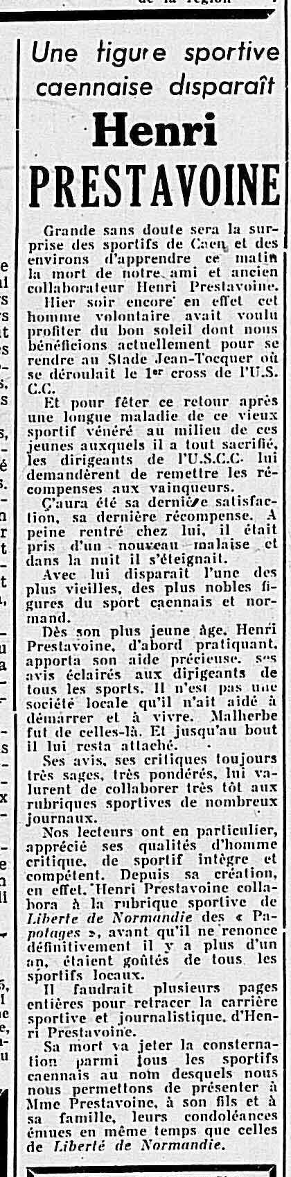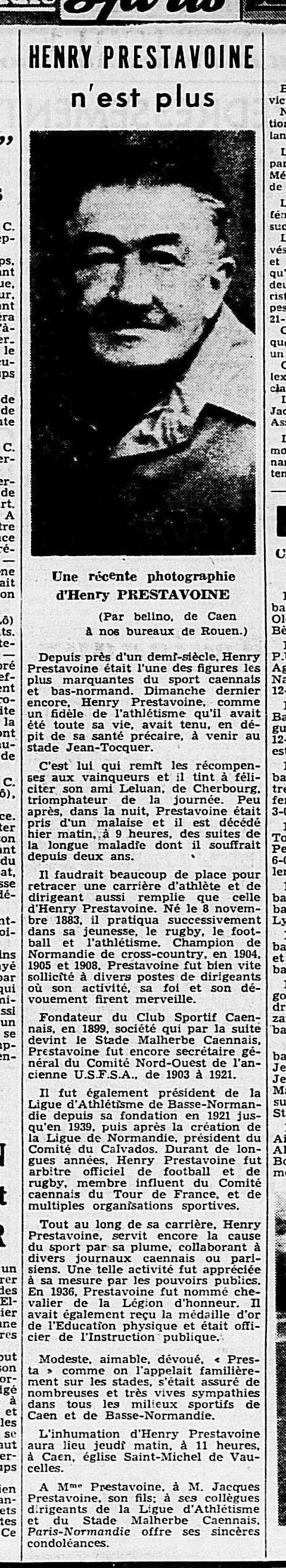 la mort d'Henry Prestavoine le 14 décembre 1953, une figure du sport bas-normand de la première partie du 20e siècle. Dommage qu'il n'y ait qu'un stade (à Hérouville) qui lui rende hommage. Son fils Jacques, toujours vivant, est l'un des fondateurs de la Butte de Caen.
