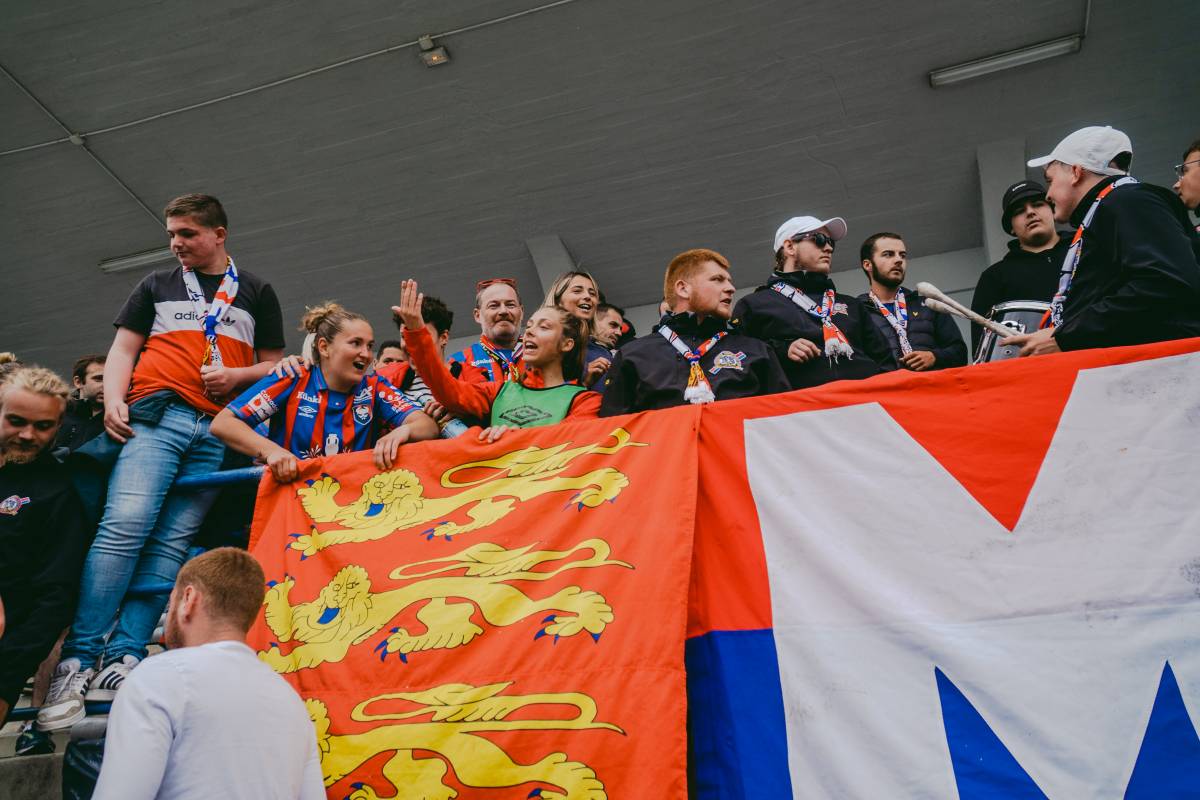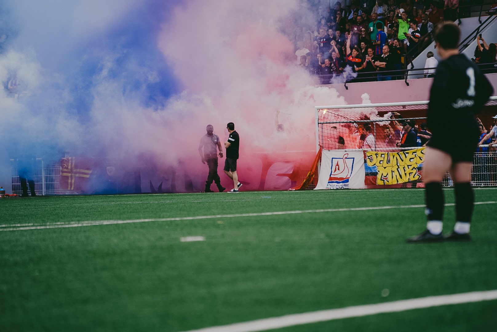 près de 1 000 personnes à Venoix pour ce dernier match à domicile de la saison ! Et surtout premier tifo organisé en l'honneur des féminines avec une phrase "ensemble nous gravirons" et une joueuse avec un maillot floqué mnk qui monte les marches vers la D2. A l'entrée des joueuses, un fumi est craqué sous l'oeil du délégué qui note tout dans son carnet :lol: Les premiers chants sont lancés mais ils sont vite éteints par le but manceau à la 2e minute. Olaf est obligé de pousser une gueulante monumentale pour remotiver les troupes et enfin l'ambiance décolle. Sur le terrain, les équipes sont du même niveau et le match est plus intéressant que contre Lattes. Moins de 8 minutes après le but manceau, sur un coup franc a priori anodin, Margaux Huamé-Danet égalise. Après cela, les chants se font plus constants, certains sont repris par le reste de la tribune copieusement garnie. La mi-temps est sifflée sur ce score de parité.