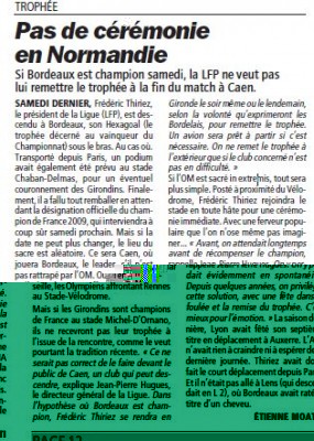 Au contraire, ça fera toujours ça de pris bon dieu :) Enfin bon, la remise du trophée, c'ets plus symbolique qu'autre chose, mais c'ets étrange, surtout si au final on se maintient, Bordeaux champion, ça ferait une belle fête, totale.