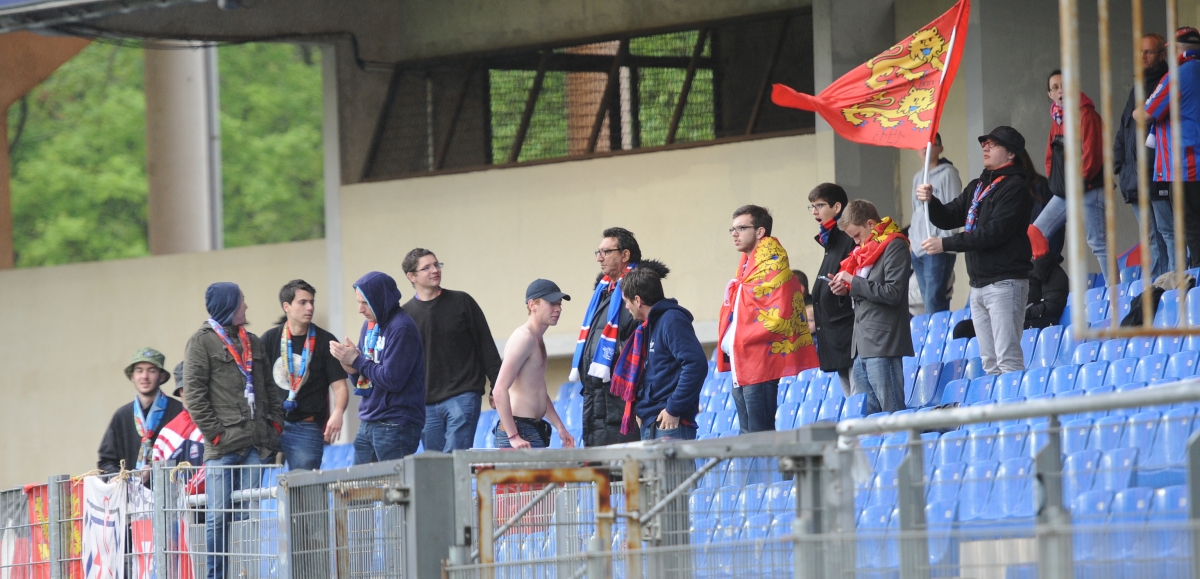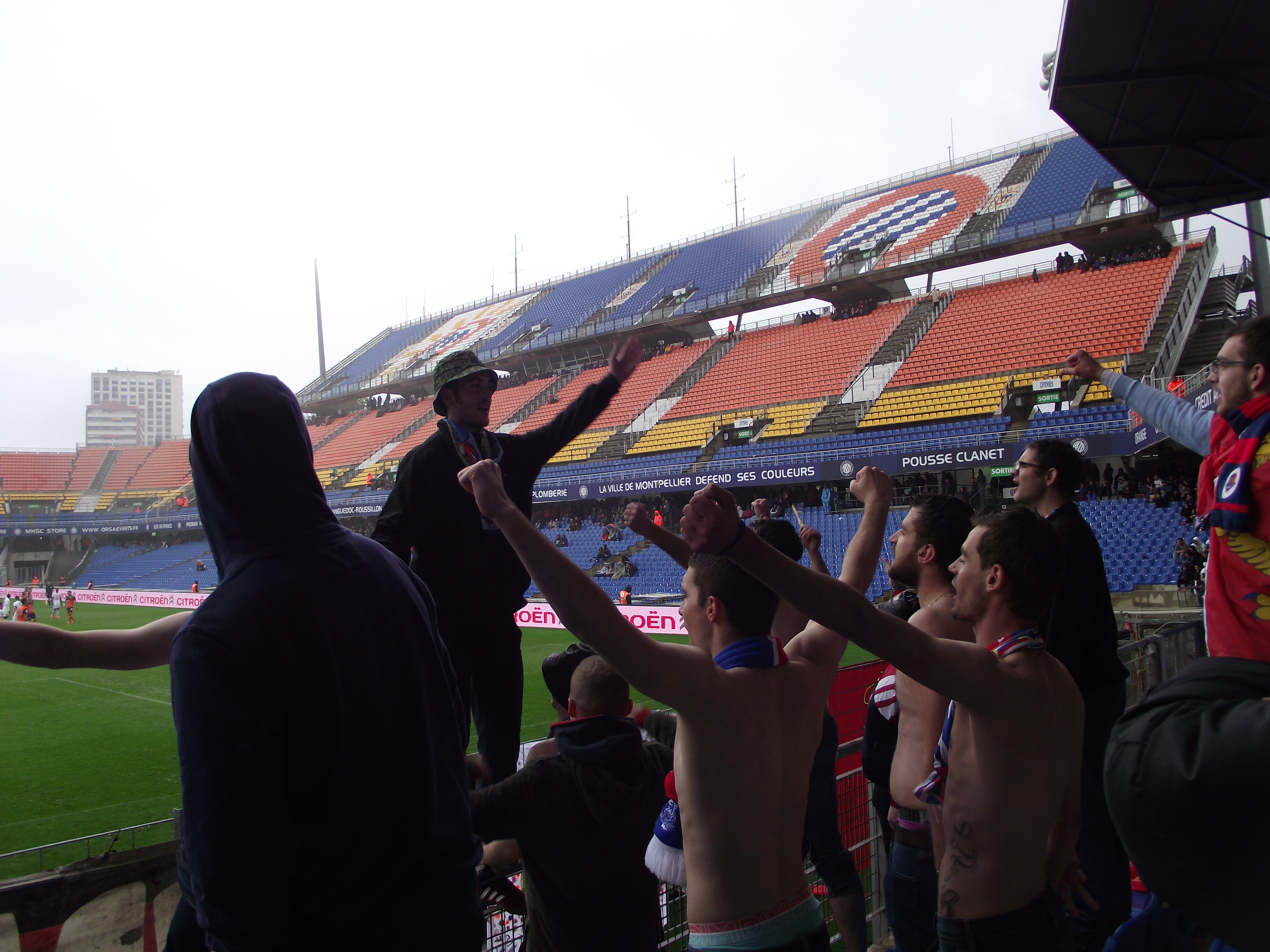 Le lendemain justement, réveil 7h30, départ 30 min plus tard dans la voiture de gazelle qui est venus nous chercher (encore merci) on arrive a 12h a Montpellier, il fait vraiment pas beau... On se retrouve a 8 dans un café place de la comédie, et les pintes coulent autant, que la flotte tombe du ciel ! 12 tournées plus tard on pars au stade, le terrain est blindé de flotte, on donne tout en parcage, on fais surtout n'importe quoi, on se prends un but mais on continueras tout le match a bouger.