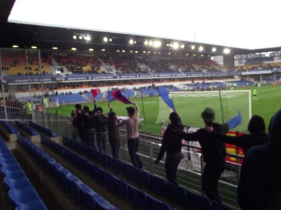 On rentre avec le J9 en parcage, les flics sont plutôt courtois et nous voila torse poil devant un piètre spectacle footballistique dut à un terrain impraticable. Difficile de se faire entendre et nous alternerons chants pour Malherbe et chants concernant notre périple !