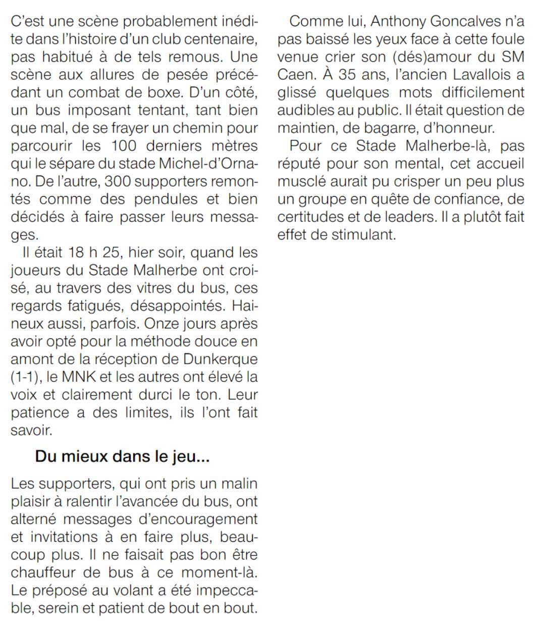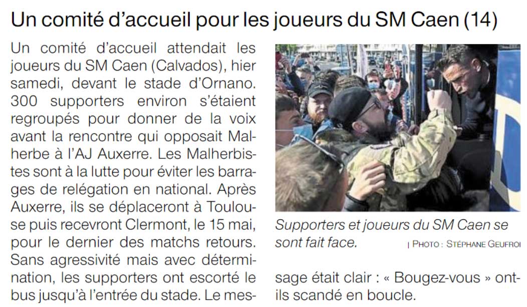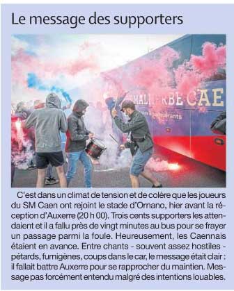 A quelques minutes de l'arrivée du bus, on apprend finalement qu'il déboulera par la rue Claude-Chappe. Les premiers chants résonnent "on est là ! Même si vous n'est pas là nous on est là!" et le bus fait son apparition. C'est un mélange de chants et de sifflets qui l'accueille, accompagné de pots de fumée, fumigènes et quelques pétards. Rapidement, la foule rassemblée sur les trottoirs s'empare de la rue et se plante devant le bus qui est vite enserré. Certains en profitent pour donner quelques coups dessus, d'autres invectivent les joueurs et d'autres encore les applaudissent. C'est finalement représentatif des différents états d'esprit des supporters caennais avant ce match. Les chants d'encouragement sont ensuite lancés grâce au tambour mais ils succèdent aussitôt à d'autres plus combatifs.