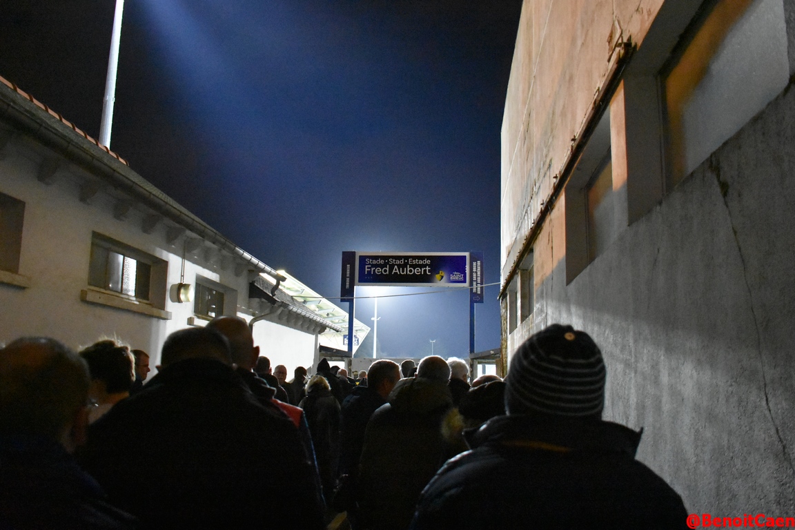 Le bus parti de Caen est lui aussi pris dans les bouchons et arrivent avec plusieurs minutes de retard sur l'horaire prévu malgré la présence d'une escorte. C'est donc à quarante minutes du coup d'envoi que le gros des troupes arrive. Une fois les billets distribués dans la confusion la plus totale, tout le monde peut rentrer ainsi que le matos alloué au tifo.