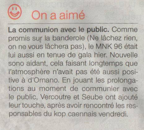 Dimanche 11h, on se retrouve en tribune pour terminer la phrase de 60m pour les joueurs : "Ne lâchez rien, on ne vous lâchera pas !". Les sacs de confettis arrivent par grappe et sont placés dans la tribune. Dès l'échauffement des joueurs, quelques chants partent, on sent le public prêt à pousser les joueurs. Comme prévu, le lancer de confettis se fait bien, les gens ayant bien respecté les consignes des capos. Les premiers chants sont bien repris, plus de monde participe, la sono aidant. Le bloc est bien plus conséquent que face à Sainté il y a 15 jours. De même, les gestuelles sont bien reprises. Arrive le penatly qui fait suite à plusieurs occasions de but et autant de poussées du kop. Grosse explosion sur le but et toute la tribune qui reprend ensuite les chants.