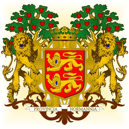 Robert Louis (qui a créé les blasons des départements) a également reproduit de nombreux blasons régionaux ou provinciaux, en utilisant des spécificités locales pour les ornements (ici, les pommiers)