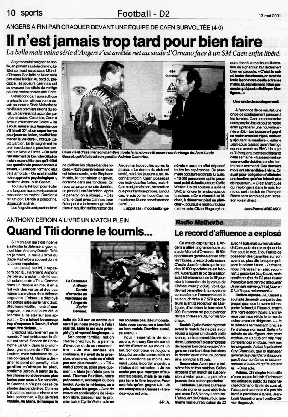 confirmation dans le compte-rendu du Ouest-France du 22 janvier 2001DuDu-Bob14 a écrit : ↑05 avr. 2024, 03:21 Concernant le nombre de buts de Cyrille Watier avec Malherbe, j'ai épluché match par match, et j'arrive à 68 buts (comme ce qui a été récemment ajouté sur Wikipedia, même si la presse continue d'écrire 66 ou 67)
