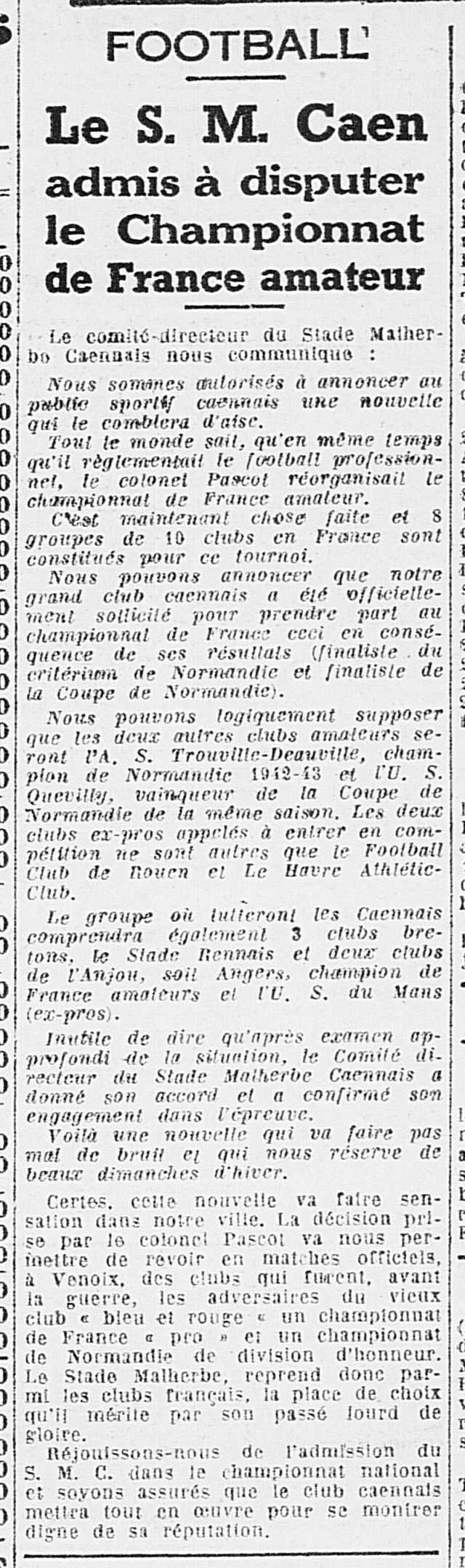 le club autorisé à jouer le championnat de France amateur en 1943-1944
