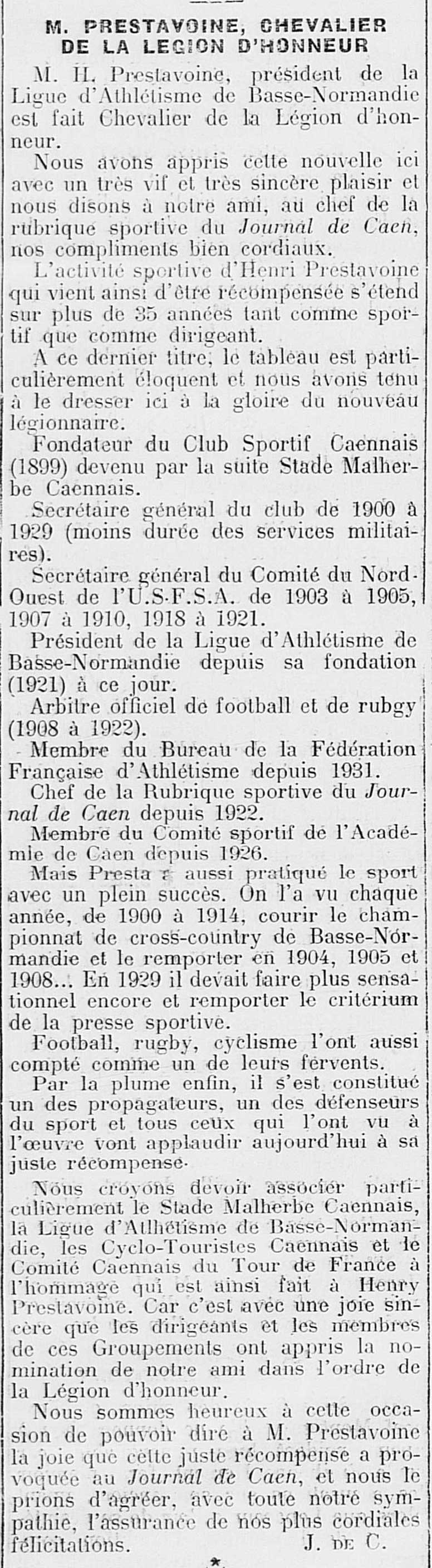 Henri Prestavoine et la légion d'honneur