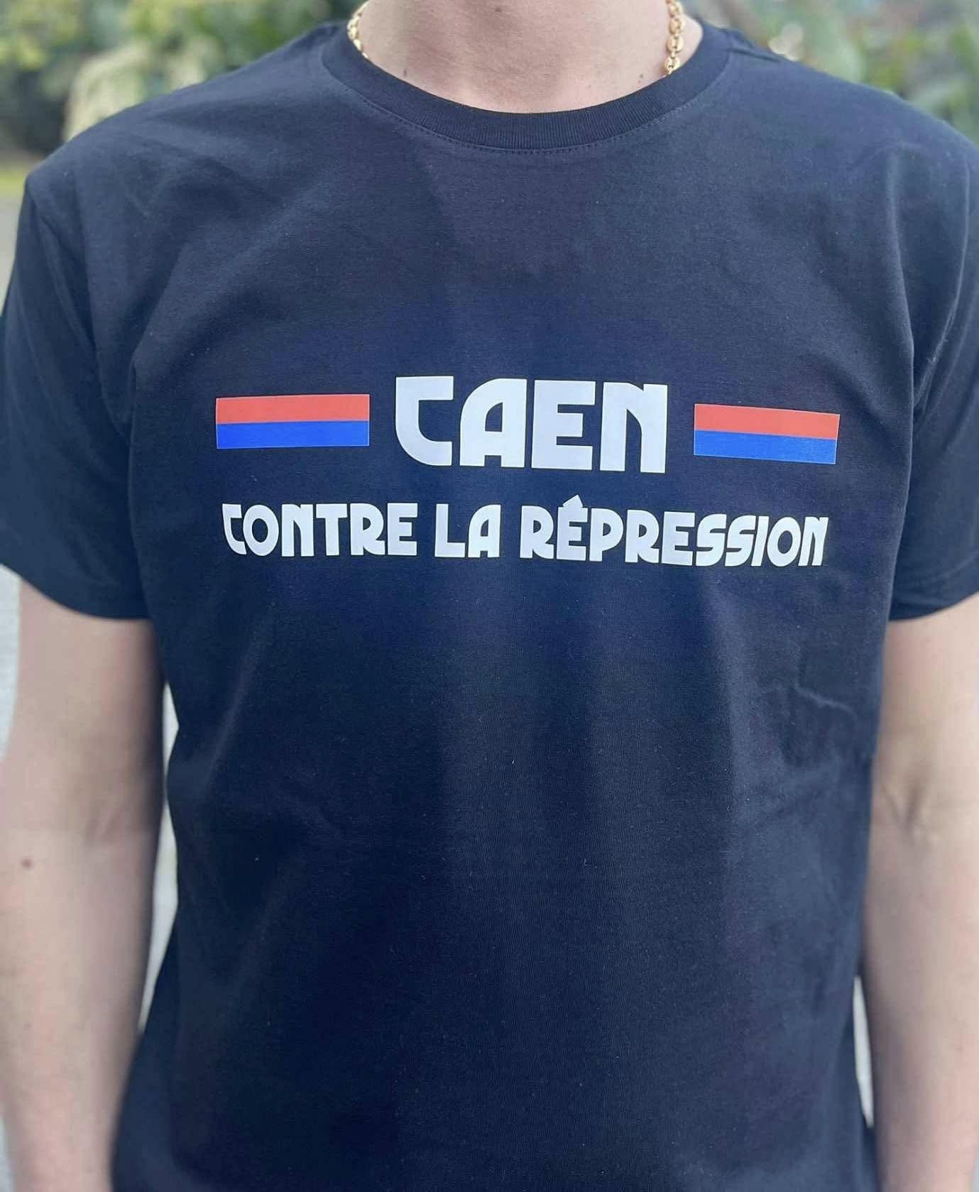tee-shirt flocage « Caen contre la répression », bénéfices reversés dans une cagnotte « frais de justice / amendes » pour soutenir nos membres.