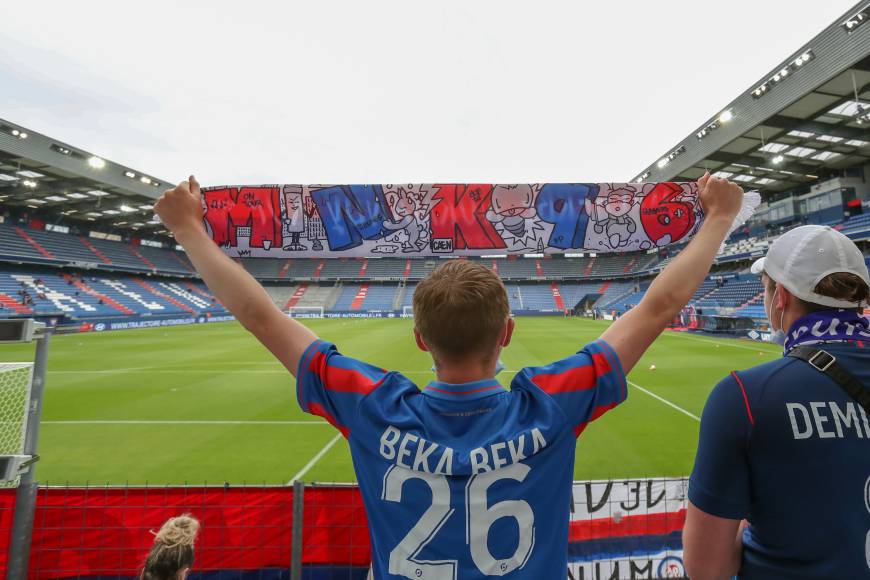 Le lendemain, on se retrouve à beaucoup pour cette prépa-tifo, quelques jeunes font résonner des chants aux alentours du stade; des voitures se garent dans les contre-allées et il en sort des sacs de confettis. Tout se petit monde prend la direction de la porte n°5. A l'entrée, deux stadiers vérifient notre statut vaccinal. Pendant que les jeunes sous la houlette de Valentin s'occupe du bâchage, la section Vieux cons (Olaf, Sophie et moi) installe la table de vente pour Émilie. Au fur et à mesure des minutes, on se retrouve de plus en plus nombreux en tribune, Othman arrive avec un maillot de Mel car le sien était trempé :lol: Une fois le gros du boulot effectué, un petit groupe dont Kevin se dirige vers la présidentielle où un maillot en hommage à Salah est accroché (astucieusement grâce à Yaya) sur sa place. On espère que le club laissera la place vacante désormais.