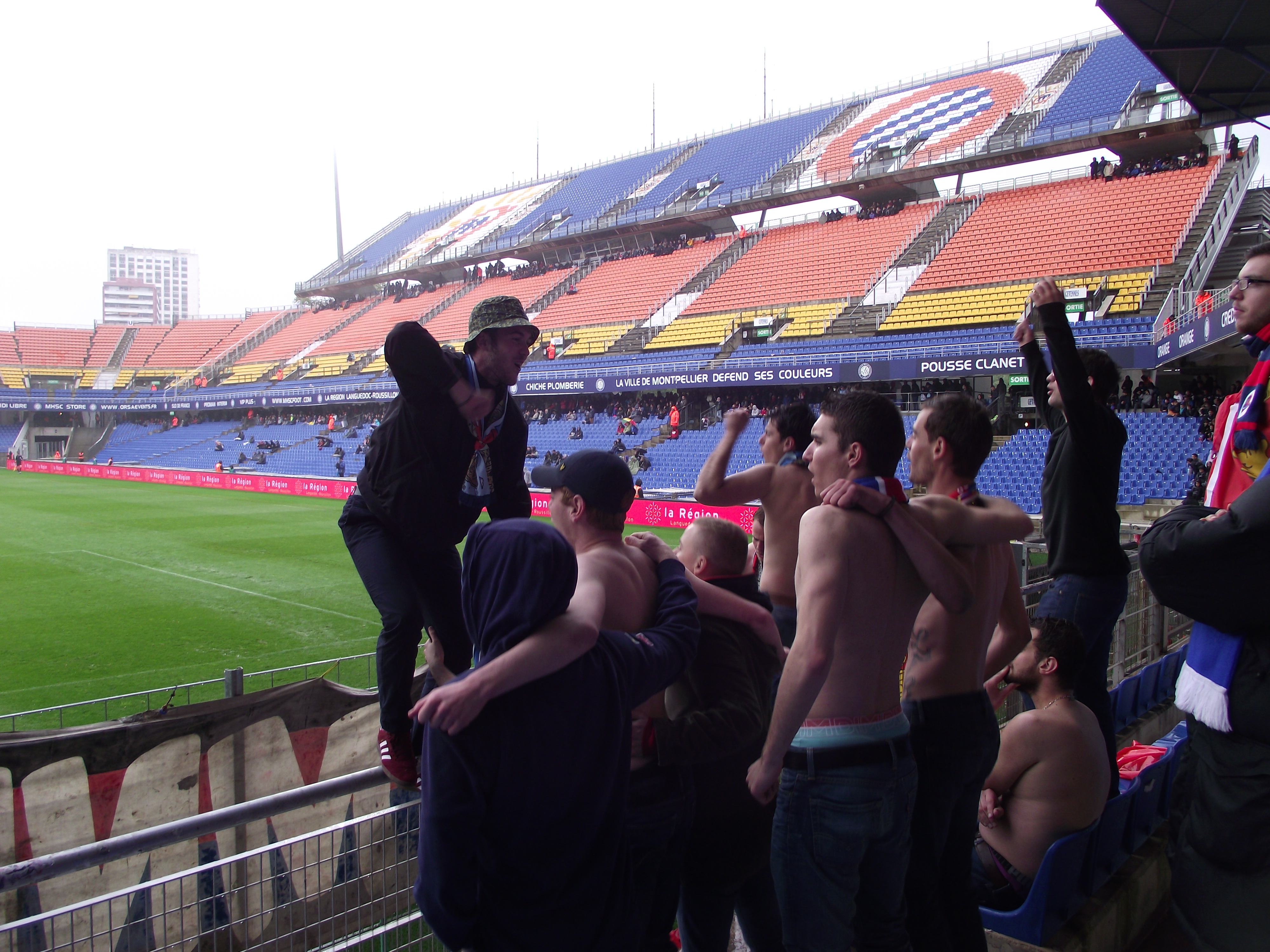 Le lendemain justement, réveil 7h30, départ 30 min plus tard dans la voiture de gazelle qui est venus nous chercher (encore merci) on arrive a 12h a Montpellier, il fait vraiment pas beau... On se retrouve a 8 dans un café place de la comédie, et les pintes coulent autant, que la flotte tombe du ciel ! 12 tournées plus tard on pars au stade, le terrain est blindé de flotte, on donne tout en parcage, on fais surtout n'importe quoi, on se prends un but mais on continueras tout le match a bouger.