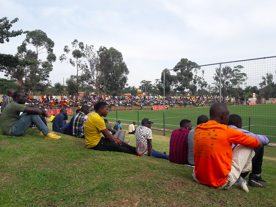 Nous partons en direction du Lugogo Stadium pour l'ouverture du championnat et un derby entre le KCCA FC et Soana FC (aussi connu sous le nom de Tooro United, mais on n'a pas compris pourquoi). Le match commence dans une heure, mais des supporters indiquent à Dudu qu'il trouvera de la bière dans le stade. On paye notre place 5000 shillings (soit 1,20 euros), et entrons dans un stade champêtre avec pelouse synthétique et sans projecteurs. En latérale une longue tribune en béton se rempli déjà, et fait face à un morceau de gradin “présidentiel” qui inspire autant confiance que la tribune que l'on a éclaté à Dreux. Le reste du public s'installe sur la butte d'herbe derrière le but en grignotant des cacahuètes. Derrière le poteau de corner, un homme bien en chair retourne les viandes sur les grilles du barbecue. Aucun marchand de bière en vue, mais le vendeur de chaussette semble faire son chiffre. Il se promène parmis les fans en portant sur son dos 50kg de chaussettes de foot de différentes couleurs. Je suis surpris par le succès de son commerce ambulant, surtout dans un pays où tout le monde est en tongs ou en sandales sans jamais porter de chaussettes. Le stade se remplit pour atteindre une affluence d'environ 2500 personnes, voire un peu plus avec les gens perchés sur les toits et murs des bâtiments voisins. En latérale, le « berger » local s'est installé tranquillement sur une branche d'un eucalyptus.