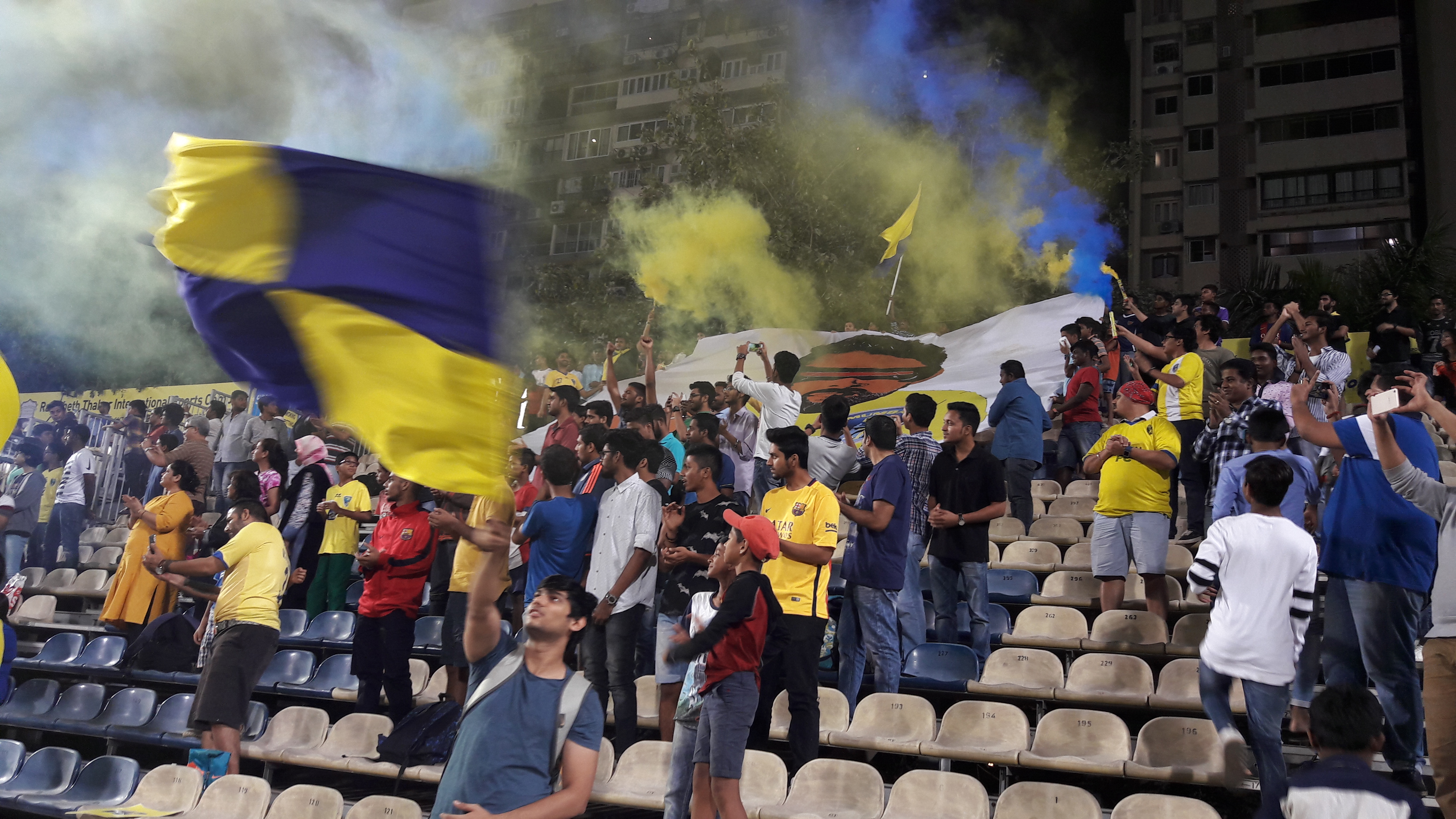 Peu de temps avant le coup d'envoi, on se dirige vers Cooperage Ground, passons le contrôle des billets, contournons les vestiaires où on voit par la fenêtre les arbitres qui se préparent, passons par une tente qui sert de cuisine pour un mariage qui a lieu juste à côté, et entrons en tribune latérale. Le stade est petit et se compose de 2 longs gradins de chaque côté du terrain. La Yellow Brigade a bâché et prépare son tifo : une petite voile avec le portrait d'un de leur joueur phare. Ils sont tous un peu gros et certains portent des lunettes, ils semblent venir des castes plutôt aisées, loin du monde de nos potes du bidonville. Le groupe distribue des grands pots de fumé, mais voilà qu'ils sont tous en panique car personne n'a de briquet. Dudu leur en prête un, sauvant ainsi l'animation du jour. Les joueurs sortent sur la pelouse, les énormes pots de fumé sont craqués mais ne produisent qu'une petite fumé bien faible. Peu importe, la quarantaine de supporters de Mumbai sont heureux comme tout, et lancent quelques chants. Presque tout leurs chants sont en anglais et sont calqués sur des chants que l'on entend dans les stades anglais. Un genre de capo lance quelque chants, mégaphone face au terrain comme s'il ordonnait aux joueurs de chanter avec lui. Les chants ne durent jamais plus de 20 secondes, et on sent que malgré une moyenne d'âge de 25 ans dans le bloc, le groupe n'en ai qu'à ses débuts. Echarpes autour des poignets, cornes de brumes comme les meilleur mastres lavallois, chants de top lads britannique et utilisation de la pyro comme des ultra italiens, on sent que les influences sont multiples mais que leur mentalité propre n'est pas encore trouvée. De l'autre côté de la latérale, les supporters d'Aizawl paraissent donner beaucoup plus de voix !