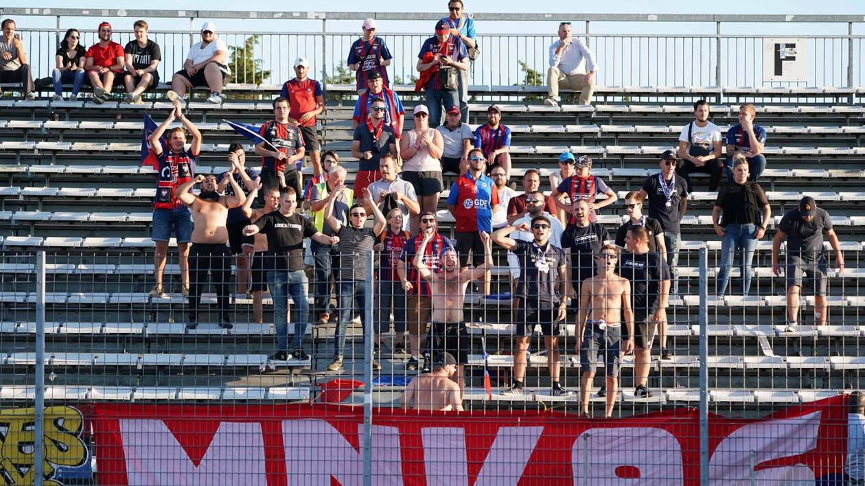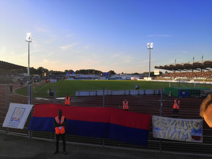 On décide de se poser dans une cave à bière afin de profiter un peu avant de se retrouver emparquer dans ce fameux stade René Gaillard, lui qui a été le théâtre de tant de folie au cours de son histoire et qui nous fait penser, dès les premiers coups d’œils et les premiers pas fait en sa direction, à un certain Furiani post 5 mai. Nous sommes rejoints par divers amoureux du stade Malherbe dont certains agnelais courageux et quelques expats dans cette tribune démontable qui sent la ligue 2 à plein nez si ce n'est le national.