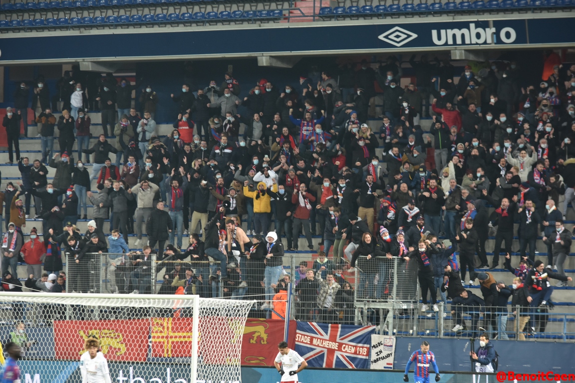 Qu'importe les conditions, le public malherbiste répond quand même présent et les tribunes se remplissent assez rapidement. En Borrelli, la table de vente est rentrée et seuls quelques drapeaux sont affichés à l'emplacement traditionnel de la bâche. Comme à son habitude, les kopistes se regroupent sur les deux blocs centraux et restent ostensiblement debout. Aucun stadier n'a l'air d'intervenir pour faire assoir les spectateurs. Quelques drapeaux sont agités au coup d'envoi et un premier chant est lancé. Olaf s'installe sur la grille avec un mégaphone et se charge de mettre l'ambiance. Avec l'absence de beaucoup de monde, le bas de la tribune parait plus jeune que d'habitude (ce n'est pas un reproche, juste un constat). C'est peut-être à cause des récents défaites mais l'ambiance n'est pas folichonne lors des dix premières minutes; il faut attendre l'éclair de jeu de Lepenant pour que la tribune se réveille un peu. Mais c'est de courte durée, on sent l'ambiance pesante. Le renouveau vient finalement d'un petit groupe en haut sur la droite du kop (quand on regarde de la pelouse), que j'ai identifié comme étant membres du groupe facebook Génération Stade Malherbe. C'est de là que partent désormais la plupart des chants qui sont repris par le reste de la tribune, parfois relayés par Olaf. La mi-temps est sifflée sous les applaudissements car les joueurs n'ont pas démérité et n'ont pas commis trop d'erreurs.