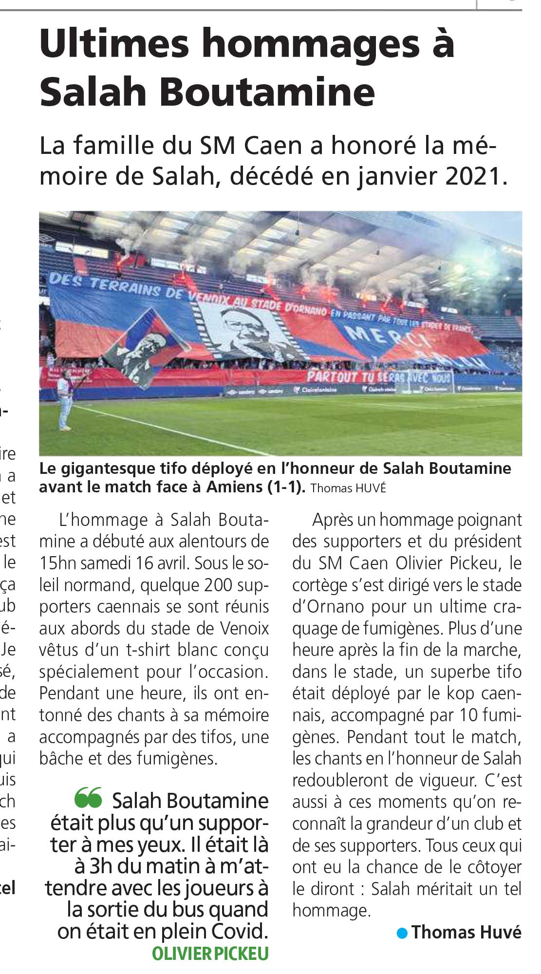 La première partie de l'hommage à proprement dit se déroule là où tout a commencé pour lui : Venoix. Le camion-boutique où on pouvait le retrouver n'est plus là mais les anciens se souviennent très bien de son emplacement à l'entrée sur la droite. Les supporters affluent et la vente de tee-shirts continuent. Très vite, les 150 exemplaires sont vendus et cela fait quelques déçus. Mais l'essentiel est là : la communauté malherbiste est rassemblée, sa famille (frères, sa femme Martine, ses enfants et petits-enfants) sont tous là. Prentakart prend le méga peu avant 16h et le cortège se met en place, Kevin (son fils), Louise et Enzo (ses petits-fils) tiennent la banderole; Martine est juste derrière tout en retenu. Le premier chant "Salah" clap clap est lancée et Louise ne peut retenir ses larmes, c'est son oncle à ses côtés qui la réconforte. Le cortège passe par le stade de Venoix et continue par les entrainements qu'il a tant arpenté. Sur la butte, une photo souvenirs est réalisée. Puis le défilé se prolonge vers le terrain synthétique. A la droite de celui-ci, derrière le terrain couvert, se trouve un bosquet qui est un peu le point central et de passage obligé de tous ceux qui vont et viennent sur les terrains d'entrainement. C'était donc l'endroit idéal pour lui dédier un petit monument. Un drapeau normand recouvre une plaque réalisée par le club (et qui a failli ne pas être prête le jour J, Antoine a vraiment insisté pour qu'elle soit installée en temps et en heure). La famille n'était pas au courant de cette partie de l'hommage. Elle se réunit autour de l'arbre et Louise et Martine dévoilent ensemble la photo du drapeau de Salah dans le kop. C'est sûrement le moment le plus intense de l'hommage, sa famille ne peut retenir ses larmes, tout comme un certain nom nombre de supporters; l'émotion s'empare de tous les présents. Prentakart après un nouveau discours passe le méga à Olivier Pickeu (présent depuis le début du défilé). Il lui faudra un très long moment avant d'être en mesure de parler tellement il est submergé par l'émotion. C'est la voix tremblante qui prend la parole rappelant la relation particulière qu'il entretenait avec Salah (de son arrivée au club en 1989 à son retour au club en 2020). Après ce discours, un temps est pris pour chacun de se recueillir devant la photo de Salah et d'aller réconforter les membres de sa famille. Le cortège reprend ensuite son parcours et passe derrière le terrain de la réserve pour enfin arriver sur l'esplanade. Un dernier hommage tout en couleurs lui est rendu juste devant le stade à coup de pyro et feux d'artifices. Il est 17h et le cortège se disloque et chacun vaque à ses occupations d'avant-match, certains restent sur l'esplanade au soleil à discuter.