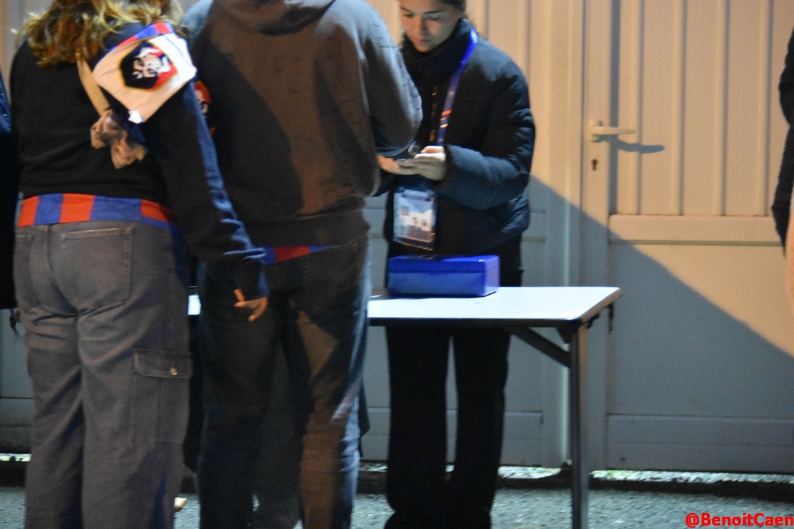 Le bus parti de Caen est lui aussi pris dans les bouchons et arrivent avec plusieurs minutes de retard sur l'horaire prévu malgré la présence d'une escorte. C'est donc à quarante minutes du coup d'envoi que le gros des troupes arrive. Une fois les billets distribués dans la confusion la plus totale, tout le monde peut rentrer ainsi que le matos alloué au tifo.