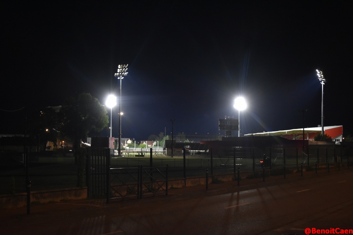 ). Dans les petites rues autour du stade, on croise aussi de nombreux caennais, en fait on va jouer quasiment à domicile ! Je passe la fouille, légère sauf mon sandwich qui ne rentre pas, et me dirige vers la tribune présidentielle. Il y a déjà aussi des Caennais dans le stade. La buvette et un food-truck sont ouverts et déjà bien squattés par des personnes portant le maillot malherbiste. A l'entrée des joueurs pour l'échauffement, les premiers chants sont lancés dans le parcage, on s'aperçoit rapidement que les chants sont repris par les deux autres tribunes. Je vois passer devant moi les membres du Young block matos sous le bras qui partent s'installer dans la tribune face à la présidentielle, ils ne sont pas très nombreux. Le parcage continue de se remplir progressivement mais le reste du stade n'est pas si garni que cela. A vu de nez, il devait avoir un peu plus de 400 Caennais hors parcage. Dans la tribune du Young block, ces derniers préviennent les spectateurs qu'ils vont déployer une voile, ce qui fait que beaucoup de spectateurs et notamment les Caennais se décalent et se regroupent dans le bloc juste à côté du parcage.