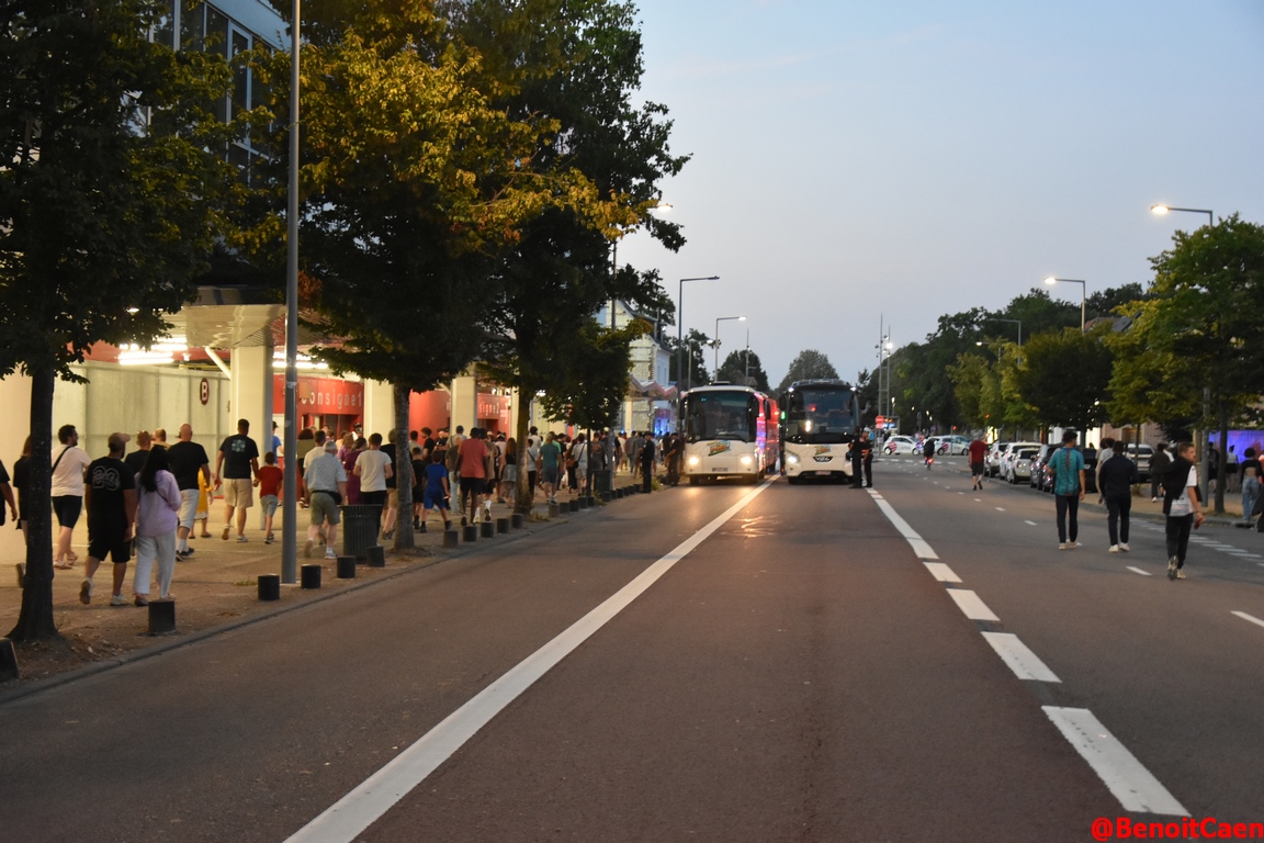 J'arrive en voiture aux abords du stade vers 18h10 et je vois passer devant moi les quatre bus du groupe escortés par la police. Dans la grande avenue qui descend du Zénith jusqu'au stade, je n'ai vu que des maillots de Malherbe ! (n'est-ce pas Warnax