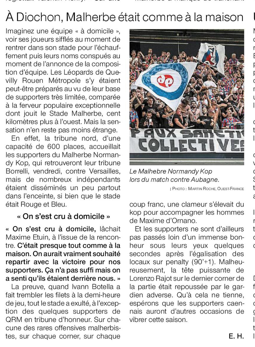 La deuxième mi-temps est un peu à l'image de nos joueurs : poussif avec un manque de peps. Nos joueurs n'arrivent pas à mettre le deuxième but qui nous mettrait à l'abri. Dans les tribunes, si l'ambiance est correcte, c'est plus compliqué de faire bouger le reste des tribunes contrairement à la première mi-temps. Mis à part sur quelques actions chaudes, il n'y a que le parcage qui assure globalement. Et la dernière minute arrive et là, c'est le drame. Un scénario à la Malherbe en somme. C'est l'occasion pour les Quevillais de se faire entendre pour la seule fois du match. Malgré un dernier chant pour dire que la Normandie est rouge et bleu. Les joueurs se regroupent au milieu du terrain et viennent saluer le parcage chaleureusement. On sent bien que des deux côtés on est frustrés du scénario du match mais l'essentiel est là : on a pas perdu